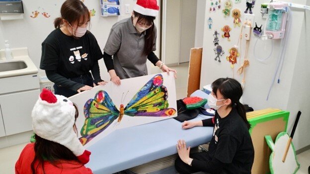 当日は、入院中の患児(0~14歳)とその保護者、施設職員の方々など約25名を対象に、大型絵本を使用した人形劇「はらぺこあおむし」を上演しました。院内クリスマス会におけるゲスト公演としては初めての試みでしたが、終始温かい雰囲気の中で円滑に進行することができました。