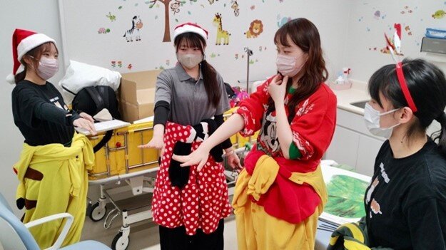 公演の最後には、部員からオリジナルグッズセットと啓発活動のカルタを一人ひとりに手渡し、ハイタッチで交流を行いました。イベント終了後、子どもたちはそれぞれ病室へ戻り、無事にすべてのプログラムを終えることができました。