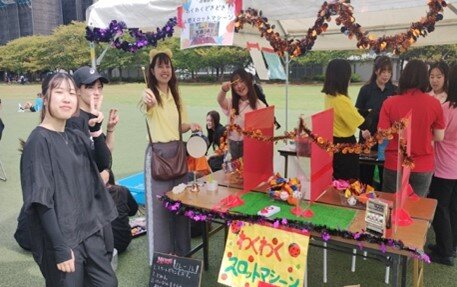 「わくわくどきどき!人間スロットマシーン」では、3人の学生がスロットマシーンの"リール"役となり、仕切りのあるボックス席に並んでスタンバイ。合図とともにポンポンを回転させ、止まった色の組み合わせによって結果が決まる、アナログならではの演出で来場者を楽しませました。結果に応じて、お菓子やシール、ステッカーなどの景品をプレゼントしました。