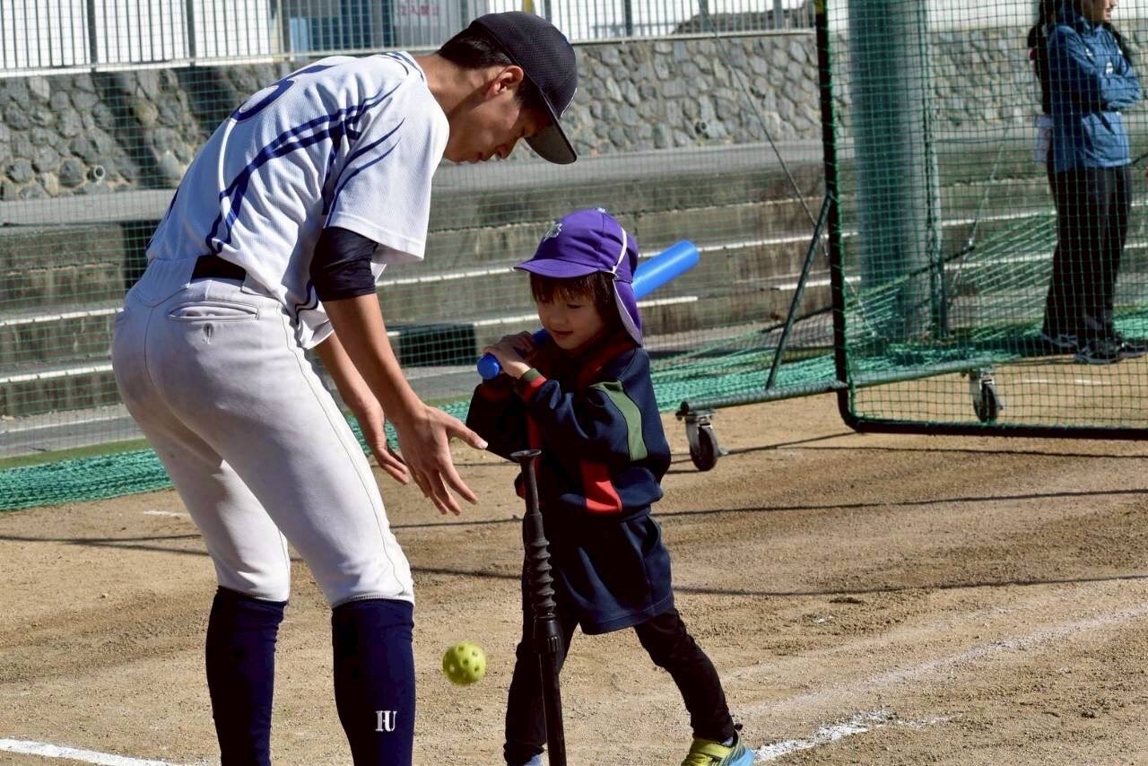 11月22日(土)、硬式野球部が、附属加古川幼稚園園児を対象に「第1回キッズベースボール体験」を開催しました。本学グラウンドに年長、年中あわせて22名の園児とその保護者にお集まりいただきイベントを実施しました。