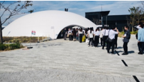 途中には国際博覧会担当大臣の伊東良孝 議員が視察に訪れ、学生たちの活動の様子を見てくださいました。完成した作品をご覧になり、「万博期間の最終日まで続けてほしいですね」とのお言葉をいただき、学生たちにとって大きな励みとなりました。