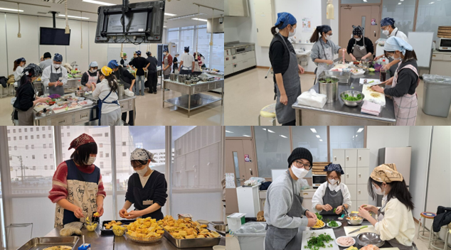 12月26日、留学生と日本人学生が交流を深める機会として、毎年実施している「国際料理教室」を、今年度は加古川市内にある東播磨生活創造センター「かこむ」創作工房A(調理室)を会場に開催しました。当日は、留学生と日本人学生あわせて18名が参加し、4班に分かれて調理を行いました。各班は、ベトナム料理・中華料理・日本料理のいずれかを担当し、声を掛け合いながら協力して一つひとつの料理を完成させていきました。