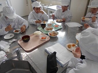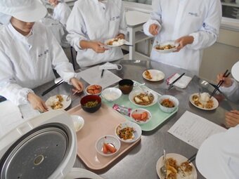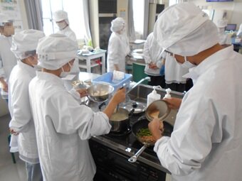 3年生科目の『臨床栄養学実習』では、医療現場等における病気の特徴に適した調理技術を修得し、理解を深めることを目的としています。
