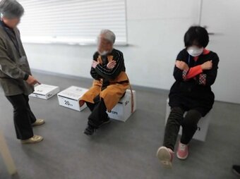 試食時間には、フレイル予防のためのお話を聞きました。試食後は、立ち上がりテストを行い、下肢筋力を調べました。 40㎝、30㎝、20㎝、10㎝の4種類の高さの台に、片脚または両脚で座り、座った姿勢から立ち上がれるかによってロコモ度を判定します。