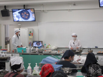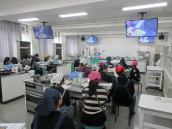 当日は、はじめに学科長より挨拶があり、その後、調理実習室へ移動しました。