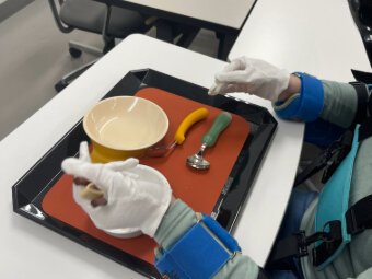 ナッツの袋を開封する、介護用食器で食事をしてみる、顎が上がると飲み込めなくなるなど、高齢者が感じる不便さや心情、食事時の姿勢の大切さへの理解を深めたようで「歩くのがゆっくりの理由がわかった」「おじいちゃんおばあちゃんに優しくしたい。」「食事をするときの姿勢が大切だとわかった」という感想がありました。