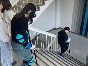 高齢者疑似体験セット「エルダートライ」を着用し、高齢化に伴う身体機能の変化を体感しました。