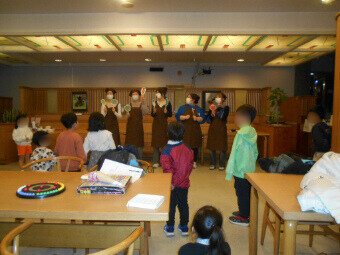 食事のあとは、音楽をかけて野菜をテーマにしたペープサート(紙で作った絵を手で動かす人形劇)を行いました。野菜の特徴を楽しく学べる内容に、こども達は興味津々で、笑顔で和やかな雰囲気になりました。
