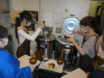 今回、ボランティアに初めて参加する学生もいましたが、経験者の学生がサポートをし、調理補助や盛り付け、配膳などを、みんなで協力しながらスムーズに作業を進めていました。こども達にも積極的に声をかけ、明るく対応する姿も多く見られました。