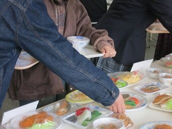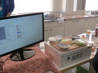 今回の体験授業では、実物大のフードモデルを選んでセンサーに乗せるだけでその食事のバランスがチェックできるSATシステムを用いて、普段の食事の栄養バランスをチェックしました。その後、バランスの良い食事とはどんなものか、簡単に改善するポイントを学び、もう一度フードモデルを選んで栄養バランスをチェックしました。