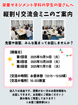 【栄養マネジメント学科】2025年度 Ⅱ期 縦割り交流会ミニのお知らせ