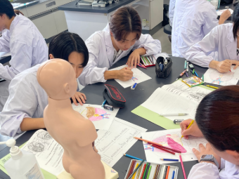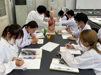 栄養マネジメント学科からのお知らせ 栄養マネジメント学科からのお知らせ 2025.10.06 【栄養マネジメント学科】授業紹介『解剖生理学実験Ⅱ』 解剖生理学実験Ⅱでは、人体の細胞・組織・器官の構造と機能をより深く学修することを目的としています。 今回は、人体模型の観察を行いました。 臓器の位置や構造を丁寧にスケッチすることで理解をより深めていくことができます。