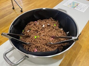 大きな鍋で、焼きそばを混ぜ混ぜ!まるで本物みたい!