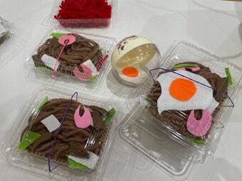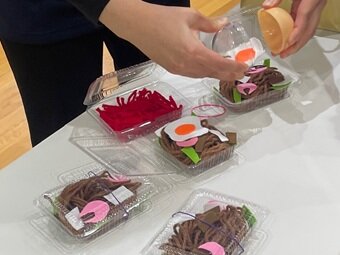 次はパックに入った焼きそばに、目玉焼きをパカッと割って、紅しょうがをのせたら出来上がり! 学生さんは子供の代わりに練習中。目玉焼きをのせて、たんぱく質をしっかり摂ってくださいね!!とお話をします。