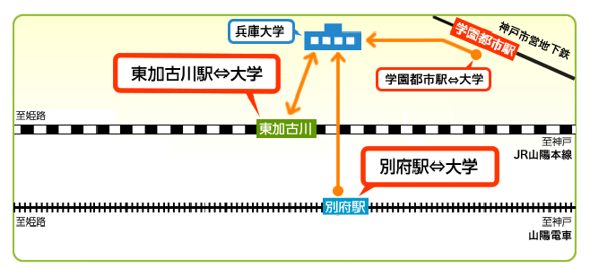 本学では学生の通学をサポートするために「神戸市営地下鉄 学園都市駅⇔大学」、「山陽電車 別府駅⇔大学」及び「JR東加古川駅⇔大学」間を往復するスクールバスを運行しています。学生証を提示することで乗車できます。