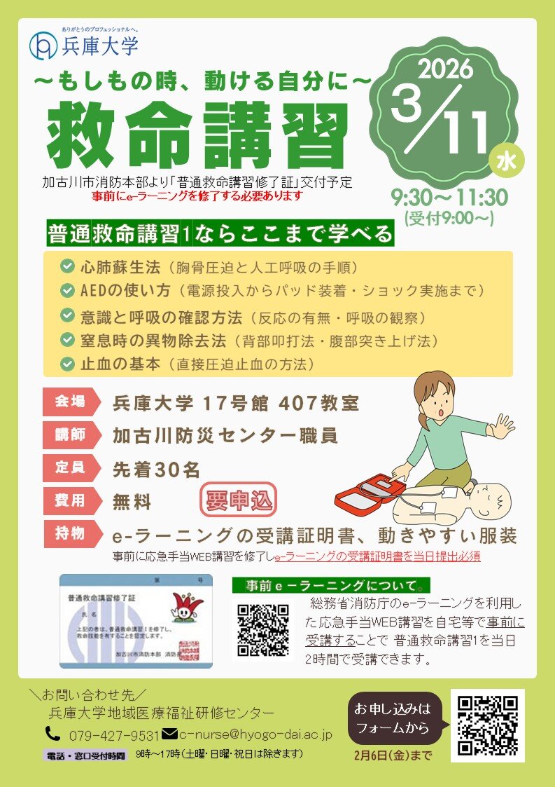 令和8年3月11日(水)に「救命講習」を実施します。