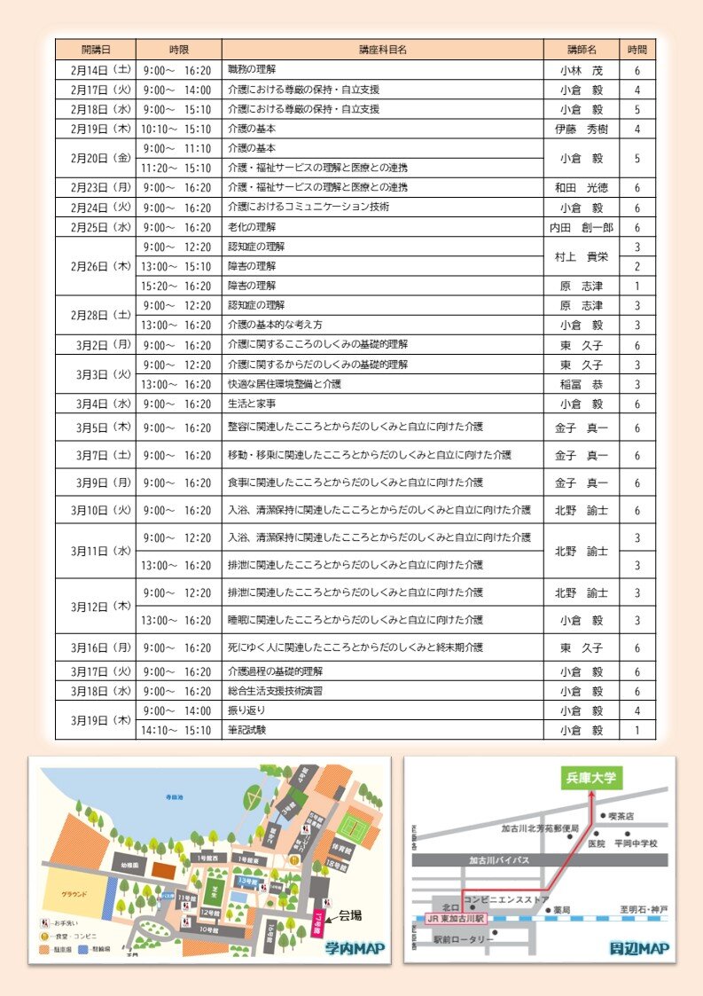 | 申し込み・ 資料請求先 | 〒675-0195 加古川市平岡町新在家2301 兵庫大学エクステンション・カレッジ事務室 兵庫県介護員養成研修係 TEL:079-427-9966 FAX:079-427-9897 |